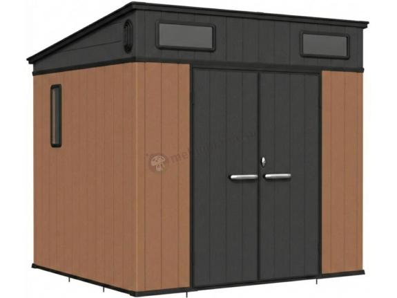 Nowoczesny domek ogrodowy. Połączenie paneli polipropylenowych o strukturze drewna ze wzmocnioną stalą konstrukcją. Całkowicie bezobsługowy.