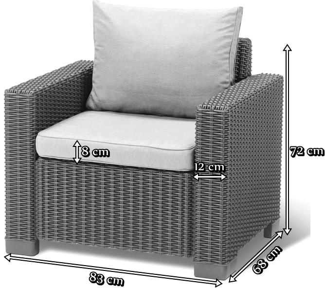 Fotele ogrodowe z zestawu California 3 Seater Brązowe wykonane są z polipropylenu formowanego wtryskowo na wzór plecionki rattanowej. Pod wieloma względami takie rozwiązanie jest praktyczniejsze i trwalsze. Fotele nie wymagają konserwacji, a czyszczenie nie stanowi problemu - wystarcza woda i dowolny środek czyszczący. Fotele mogą pozostać na zewnątrz przez cały rok, producent zaleca jednak ich schowanie podczas dużych opadów śniegu lub bardzo niskich temperatur. Fotele prezentują się bardzo nowocześnie i będą idealnym uzupełnieniem do naszego ogrodu lub tarasu. Dla odpowiedniego komfortu zastosowano wygodną poduszkę siedziskową o grubości 8 cm oraz poduszkę oparciową.