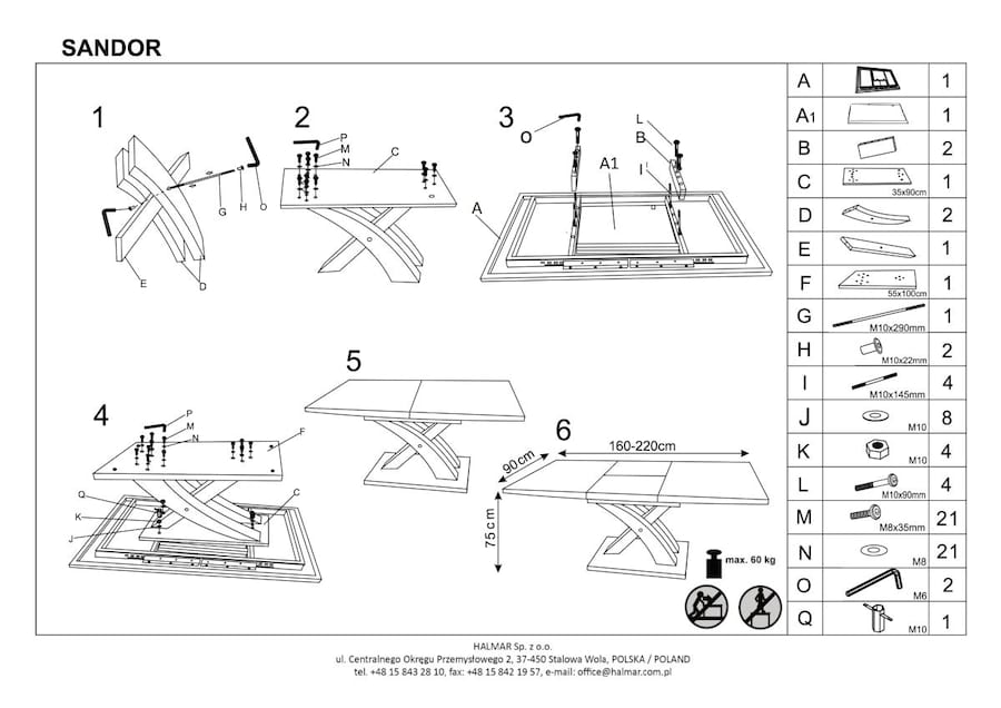 Drewniany stół rozkładany Sandor ma 90 cm szerokości, 78 cm wysokości i 160 cm długości bazowej, którą można zwiększyć za pomocą specjalnego segmentu do 220 cm. Stół waży 87 kg, co jest niepodważalnym dowodem jego solidności, stabilności i wytrzymałości. Dodatkowa wkładka wydłużająca przechowywana jest pod blatem - wystarczy rozsunąć segmenty blatu, pod którymi znajduje się wkładka zamontowana na zawiasach.