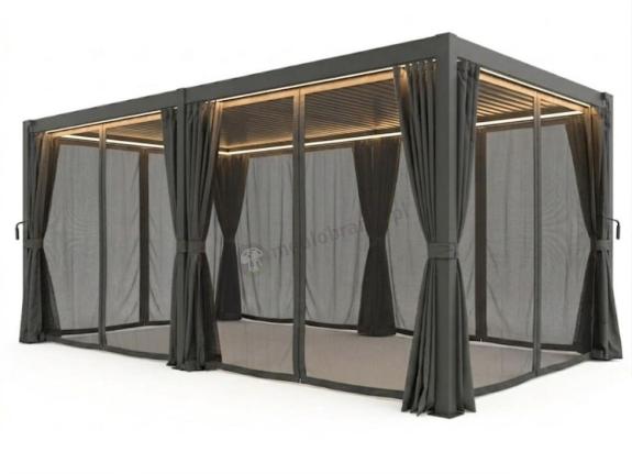 Pergolę Nefir można uzupełnić o elementy dodatkowe takie jak oświetlenie LED, moskitiery, rozsuwaną roletę lub zasłony, które chronią przed słońcem i zapewniają prywatność.