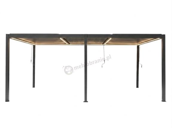 Nogi pergoli mają profil 10x10 cm, wykonane są z aluminium o grubości 1,3 mm - taka podstawa zapewnia stabilność całej konstrukcji. Pergola jest wolnostojąca, ma 6 nóg i nie wymaga przymocowania do elewacji.