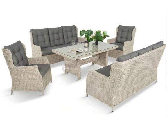 Komplet mebli ogrodowych z technorattanu Fiorneto to kwintesencja stylu i wytrzymałości. W skład opisywanego kompletu wchodzą dwie duże, trzyosobowe sofy o szerokości 178cm, dwa fotele oraz duży stół ogrodowy 160x90 cm. Na każde siedzisko i oparcie przewidziano wygodną poduszkę. To idealny wybór dla wymagających klientów, którzy pragną stworzyć w swoim ogrodzie przestrzeń pełną stylu i komfortu. Meble wykonane z wysokiej jakości materiałów zachwycają nie tylko estetyką, ale i odpornością na upływ czasu.