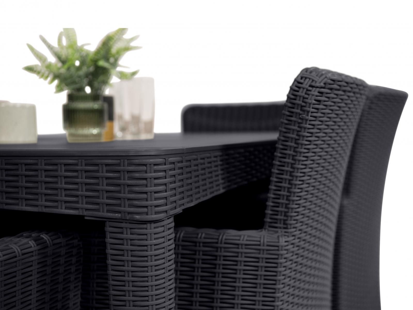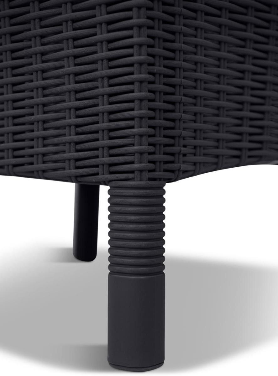 Przy wyborze odpowiednich mebli do ogrodu najważniejsza jest ich trwałość. Zaprezentowany fotel został wykonany z materiału odpornego na warunki atmosferyczne, który nie wymaga konserwacji. Dzięki temu nie trzeba się martwić, że meble stracą kolor pod wpływem szkodliwych promieni UV lub obfitych opadów deszczu. Jeśli chodzi o wygląd, krzesła charakteryzują się ozdobną fakturą w stylu plecionki, co kojarzy się z meblami wykonanymi z technorattanu.