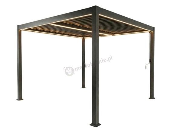 Oświetlenie LED jest wbudowane w górną belkę pergoli. Zestaw obejmuje taśmy LED o łącznej mocy 12W, które tworzą przytulną atmosferę i umożliwiają korzystanie z ogrodu po zmroku. Zintegrowana konstrukcja eliminuje potrzebę dodatkowych lamp i widocznych kabli.