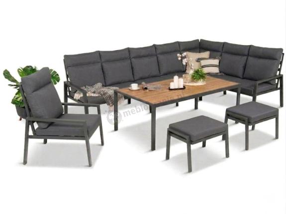 Grafitowy narożnik ogrodowy 184x294cm modułowy ze stołem obiadowym i fotelem Doros Corner XXL - Polywood Dark Grey