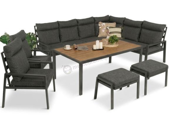 Zestaw modułowy - dwie sofy dwuosobowe, moduł narożny i moduł środkowy - pozwala swobodnie stworzyć narożnik prawo lub lewostronny, dzięki czemu bez trudu dopasujesz układ do tarasu czy balkonu. Duży stół o wymiarach 160x90 cm zapewnia wygodną przestrzeń do wspólnych posiłków i spotkań, tworząc idealne miejsce do relaksu w gronie bliskich.