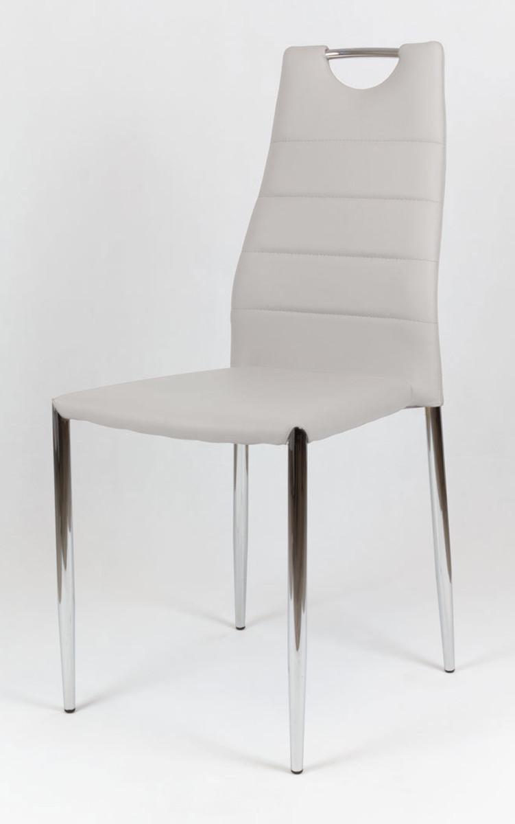 Jasnoszare krzesło tapicerowane KS005 opiera się na czterech metalowych nogach wykończonych chromowaniem. Oparcie lekko wyprofilowano dla większej wygody użytkownika.