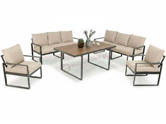 Oferowany zestaw mebli ogrodowych posiada stalowy stelaż. Stal została pomalowana proszkowo, co sprawia, że meble są bardziej odporne na działanie zmiennych warunków pogodowych oraz korozję. Stelaż jest solidny i wytrzymały - metalowe poprzeczki pod poduszkami zapewniają maksymalny udźwig każdego siedziska do 150kg! Dla sofy 3 osobowej, to 150kg na każde z 3 siedzisk. Blat stołu pokrywają wytrzymałe panele z polywood. Jest to wyjątkowo odporny materiał wykonany z tworzywa sztucznego, do złudzenia przypominający wizualnie drewno. Połączenie stalowego stelaża z materiałem imitującym drewno sprawia, że komplet prezentuje się bardzo nowocześnie i elegancko. Meble posiadają także stopki, które zapobiegają niszczeniu się stelaża, w szczególności podczas przesuwania elementów kompletu. Dzięki temu zestaw Panaon posłuży nam przez dłuższy czas.