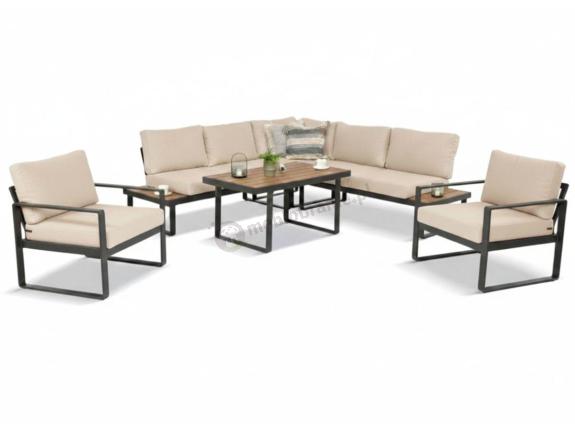 Meble ogrodowe Panaon to propozycja, która spełni oczekiwania nawet najbardziej wymagających Klientów. W skład opisywanego kompletu wchodzi stół ogrodowy o wymiarach 110x60cm i wysokości 52 cm, dwa fotele oraz narożnik składający się z modułów: dwóch sof dwuosobowych i modułu narożnego. Na każde siedzisko i oparcie przewidziano grubą poduszkę. Po złożeniu elementów otrzymujemy narożnik o wymiarach 220x220cm - dzięki budowie modułowej z każdego siedziska korzystać można oddzielnie. Komplet wykonano z wysokiej jakości materiałów, zachowując jednocześnie najwyższą dbałość o każdy szczegół.