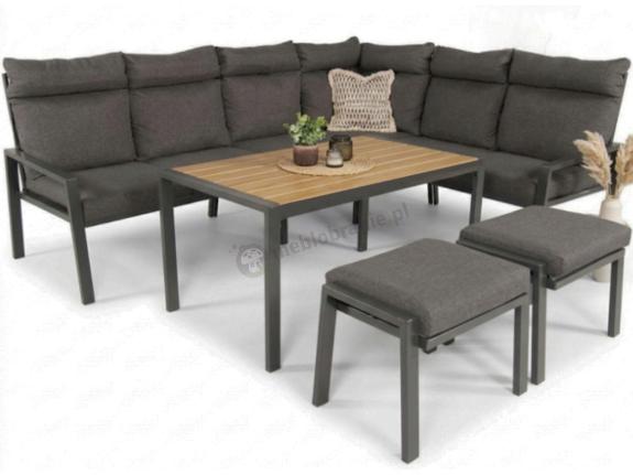 Zestaw modułowy - dwie sofy dwuosobowe, moduł narożny i moduł środkowy - pozwala swobodnie stworzyć narożnik prawo lub lewostronny, dzięki czemu bez trudu dopasujesz układ do tarasu czy balkonu. Stół o wymiarach 120x70 cm zapewnia wygodną przestrzeń do wspólnych posiłków i spotkań, tworząc idealne miejsce do relaksu w gronie bliskich.