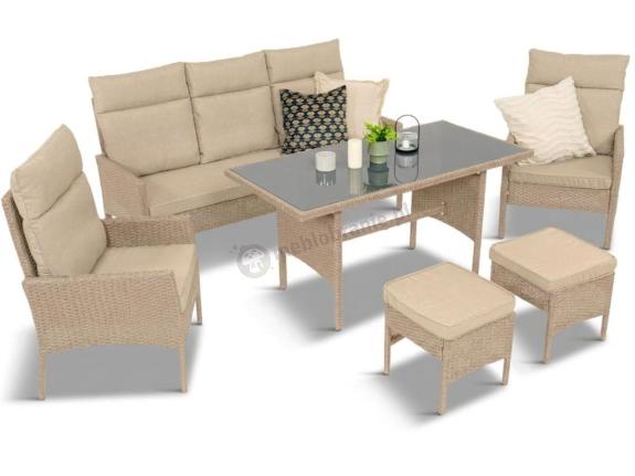 Duży zestaw mebli z technorattanu Lirata Dining Natural to wygodny i praktyczny zestaw mebli ogrodowych. W zestawie znajduje się uniwersalny stół ogrodowy idealny zarówno do porannej kawy jak i obiadu na świeżym powietrzu, sofa trzyosobowa, dwa fotele ogrodowe oraz dwie pufy. Meble są niezwykle wygodne - mają wysokie oparcia, które będą komfortowe nawet dla wysokich osób! Pufy tworzą dodatkowe miejsce do siedzenia, mogą także służyć jako podnóżki. Do każdego siedziska i oparcia dołączona jest poduszka. Zestaw został wykonany z materiałów wysokiej jakości, z dbałością o szczegóły wykonania kompletu.