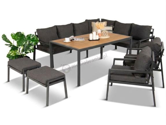 Meble ogrodowe zachowane są w prostym, nowoczesnym stylu - wykończenie w kolorze grafitowym sprawia, że meble idealnie wkomponują się w modernistyczną przestrzeń miejskich patio czy balkonów. Minimalistyczny design wyróżnia je na tle innych zestawów i czyni wyjątkowo atrakcyjnymi. Ogrodowy stół o wielkości blatu 160x90 cm wykończony jest eleganckim blatem z polywood. Jest to materiał do złudzenia przypominający drewno. Stół ma prostą klasyczną bryłę i jest wykonany na stalowym stelażu. Komplet Sodor Corner XL będzie modnym akcentem na naszym tarasie, jednak dzięki neutralnym uniwersalnym odcieniom szarości sprawdzi się przez wiele sezonów.