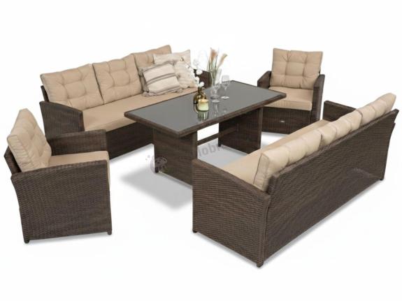 Zestaw mebli technorattanowych to propozycja, która spełni oczekiwania nawet najbardziej wymagających Klientów. W skład opisywanego kompletu wchodzi prostokątny, duży stół jadalniany o długości 145cm, dwie duże, 3 osobowe sofy (186cm) oraz dwa fotele. Na każde siedzisko i oparcie przewidziano wygodną poduszkę. Komplet wykonano z bardzo dobrych jakościowo materiałów, zachowując jednocześnie najwyższą dbałość o każdy szczegół. Meble te nadają się nie tylko do użytku wewnętrznego ale i zewnętrznego.