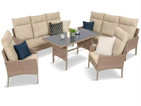 Duży zestaw mebli z technorattanu Lirata Grande Natural to wygodny i praktyczny zestaw mebli ogrodowych. W zestawie znajduje się uniwersalny stół ogrodowy idealny zarówno do porannej kawy jak i obiadu na świeżym powietrzu, dwie wygodne sofy trzyosobowe, oraz dwa fotele ogrodowe. Komplet charakteryzuje się wysokim oparciem, dzięki czemu jest niezwykle wygodny, nawet dla osób wysokich. Do każdego siedziska i oparcia dołączona jest poduszka. Zestaw został wykonany z materiałów wysokiej jakości, z dbałością o szczegóły wykonania kompletu.