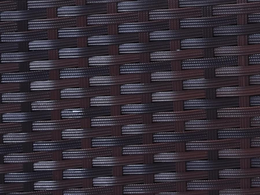 Plecionka technorattanowa Farlito Brown Along - stanowi przeplot niejednolitych kolorystycznie włókien w kolorze ciemno brązowym jej struktura jest wzdłużnie prążkowana z charakterystycznym skośnym nacięciem na każdym prążkowaniu, jest połyskliwa.