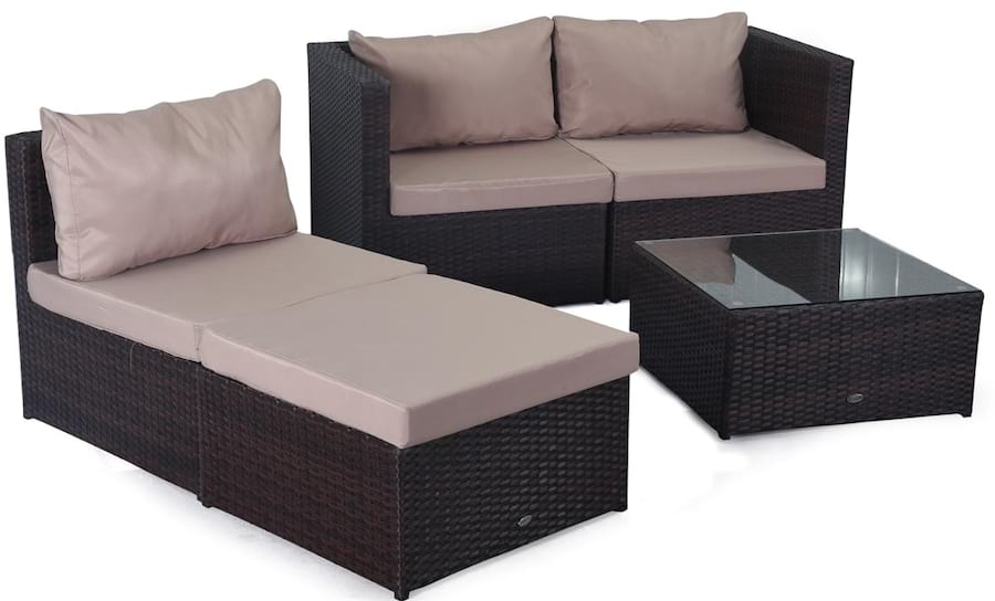 Proponowany komplet ogrodowy z technorattanu FARLITO V Brown Along & Latte to zestaw w kształcie narożnika, który składa się z czterech modułów siedziskowych oraz stolika. Dwa moduły narożne oraz moduł środkowy zestawione razem tworzą sofę trzyosobową, zaś pufka może być stosowana jako dodatkowe siedzisko lub podnóżek, który zwiększy komfort wypoczywania. Oparcia oraz podłokietniki w modułach mają 8cm szerokości, co sprawia że są wygodne oraz doskonale się komponują pod względem proporcji z całym kompletem mebli.