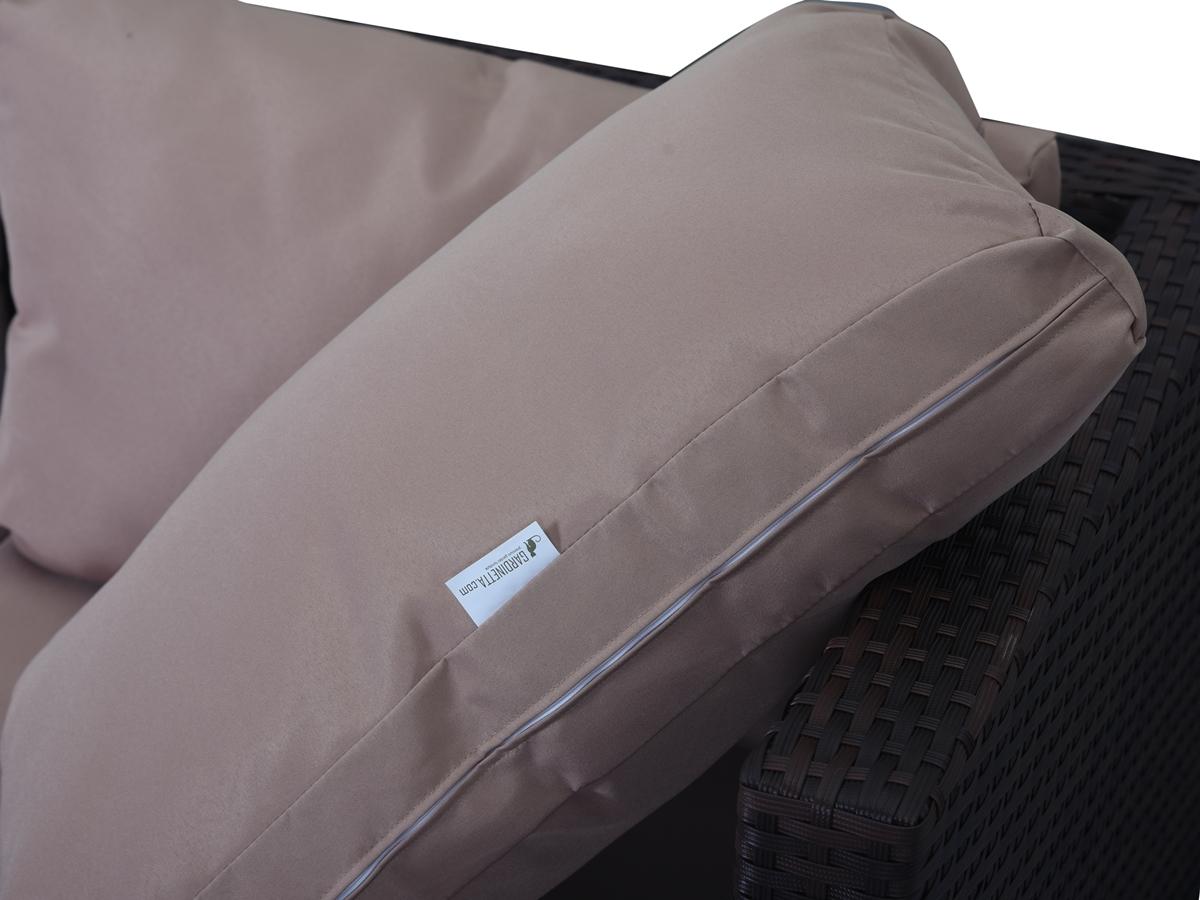 Włókna technorattanowe charakteryzują się wyższą odpornością na działanie warunków atmosferycznych tj. mróz, deszcz, śnieg, promieniowanie słoneczne/UV, względem naturalnego rattanu. Ich wykorzystanie jako materiału do mebli ogrodwych to doskonałe rozwiązanie. W meblach FARLITO Brown Along struktura plecionki jest wzdłużnie prążkowana z połyskliwą fakturą, która bardzo dobrze komponuje się z poduszkami w kolorze latte, tworzac ciepłą i przyjemną dla relaksu całość.