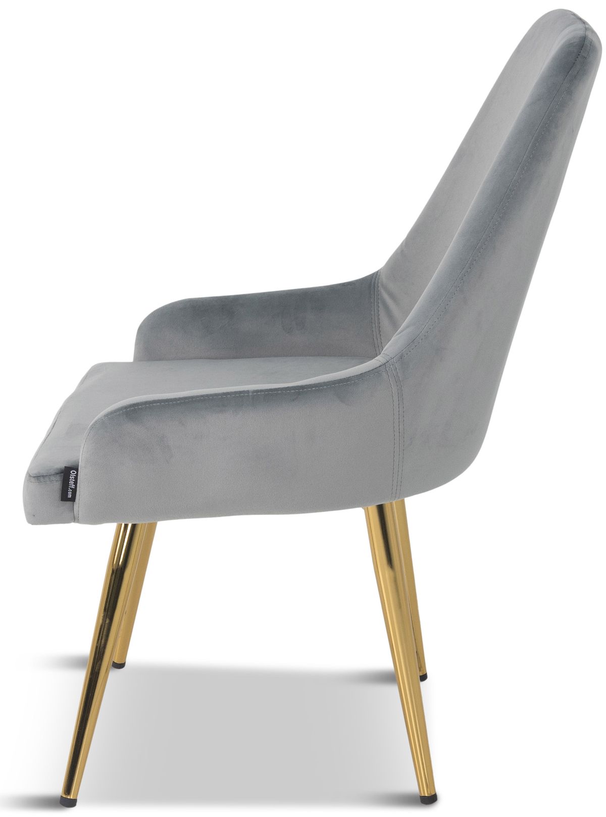 Krzesło tapicerowane Miguel posiada miękkie siedzisko oraz oparcie tapicerowane tkaniną. Materiał ten to welur - jest bardzo przyjemny w dotyku - pokryty miękkim w dotyku krótkim meszkiem, który zachwyca połyskiem. Metalowe nóżki podtrzymujące krzesło zostały pomalowane metodą proszkową na złoty kolor, co zwiększyło ich wytrzymałość oraz odporność na korozję. Produkt wymaga samodzielnego montażu nóg.
