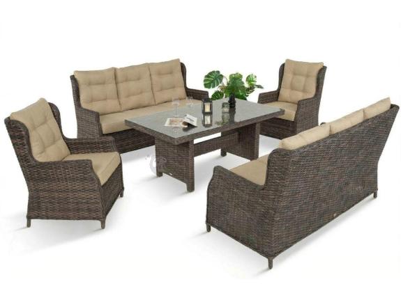 Zestaw mebli technorattanowych Fiorento Grande zapewnia najwyższy komfort użytkowania. Sofa i fotele mają wysokie oparcia, które gwarantują maksymalną wygodę nawet podczas wielogodzinnego wypoczynku. Przestronne sofy pozwalają całkowicie się zrelaksować - dzięki dużemu siedzisku można swobodnie wyprostować nogi i znaleźć idealną pozycję do odprężenia. Maksymalny udźwig dla każdego siedziska wynosi do 120kg! Dla sofy trzyosobowej to 120kg na każde z 3 siedzisk. Duży stół obiadowy 160x90 cm sprawdzi się idealnie zarówno jako stolik do odpoczynku z kawą i książką a także jako stół obiadowy do wygodnego zjedzenia posiłku na świeżym powietrzu. Masywne nogi sprawiają, że jest solidny i stabilny. Jego blat pokryty jest hartowanym szkłem - zapewnia to bezpieczeństwo podczas użytkowania i trwałość blatu.
