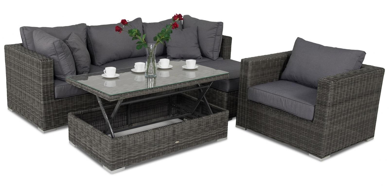 Ligurito VI Dark Grey to seria ekskluzywnych mebli technorattanowych, które doskonale sprawdzą się w ogrodzie i na tarasie. Zestaw składa się z 6 elementów - 2 modułów narożnych, 1 moduł środkowego, fotela, pufy oraz podnoszonego stolika. Zestaw wykonany został z półokrągłego technorattanu gwarantującego odporność mebli, zaś poduszki na siedziskach i oparciach podwyższają komfort wypoczynku.