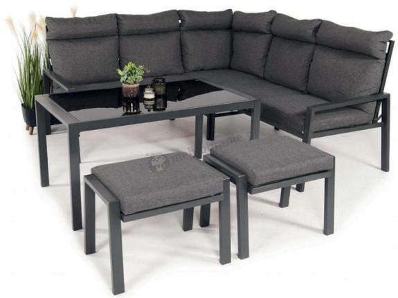 Metalowy narożnik z wysokim oparciem oraz uniwersalnym stołem redefiniuje wygodę wypoczynku na tarasie tworząc idealny balans między relaksem a funkcjonalnością.