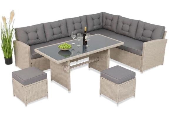 Zestaw mebli z technorattanu to propozycja, która spełni oczekiwania nawet najbardziej wymagających Klientów. W skład opisywanego kompletu wchodzi prostokątny, duży stół jadalniany o długości 145cm, dwie pufy oraz narożnik składający się z dwóch sof dwuosobowych, modułu środkowego i moduły narożnego. Dzięki modułowej budowie narożnik może być lewo bądź prawostronny. Całkowite wymiary narożnika po zestawieniu modułów to 250x190cm. Na każde siedzisko i oparcie przewidziano wygodną poduszkę. Komplet wykonano z bardzo dobrych jakościowo materiałów, zachowując jednocześnie najwyższą dbałość o każdy szczegół. Meble te nadają się nie tylko do użytku wewnętrznego ale i zewnętrznego.