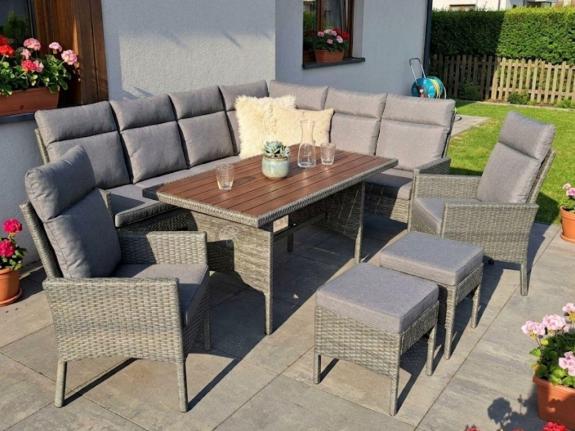 Szary zestaw technorattanowy oferuje najwyższy komfort użytkowania, na który bezpośredni wpływ mają odpowiednio wyprofilowane, wysokie oparcia narożnika. Nawet podczas wielogodzinnego użytkowania nie odczujemy dyskomfortu również dzięki temu, że poduszki są miękkie i sprężyste, a na podłokietnikach można wygodnie oprzeć ręce. Blat stołu jadalnianego to wykonany jest z polywood. Jest to materiał do złudzenia przypominający drewno. Poduszki mają poszewki na zamek błyskawiczny. Poduszki oparciowe posiadają rzepy, którymi można przymocować je do stelaża. Poszewki zostały też zabezpieczone specjalną warstwą hydrofobową, która chroni przed wchłanianiem rozlanych płynów.