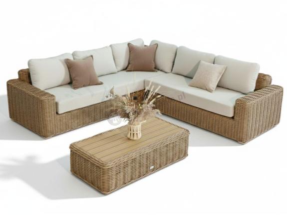 Konstrukcja zestawu oparta jest na lekkim, a jednocześnie bardzo trwałym aluminium, które zapewnia stabilność i odporność na warunki atmosferyczne. Wykończenie stanowi wysokiej jakości okrągły technorattan o grubości 9 mm - materiał odporny na promieniowanie UV, wilgoć i zmienne temperatury, zachowujący estetyczny wygląd przez długi czas. Stolik kawowy wyposażono w elegancki blat z polywood, który łączy naturalny wygląd drewna z wyjątkową trwałością i łatwością pielęgnacji. Meble posiadają stopki, dzięki którym dłużej zachowają świetny wygląd.