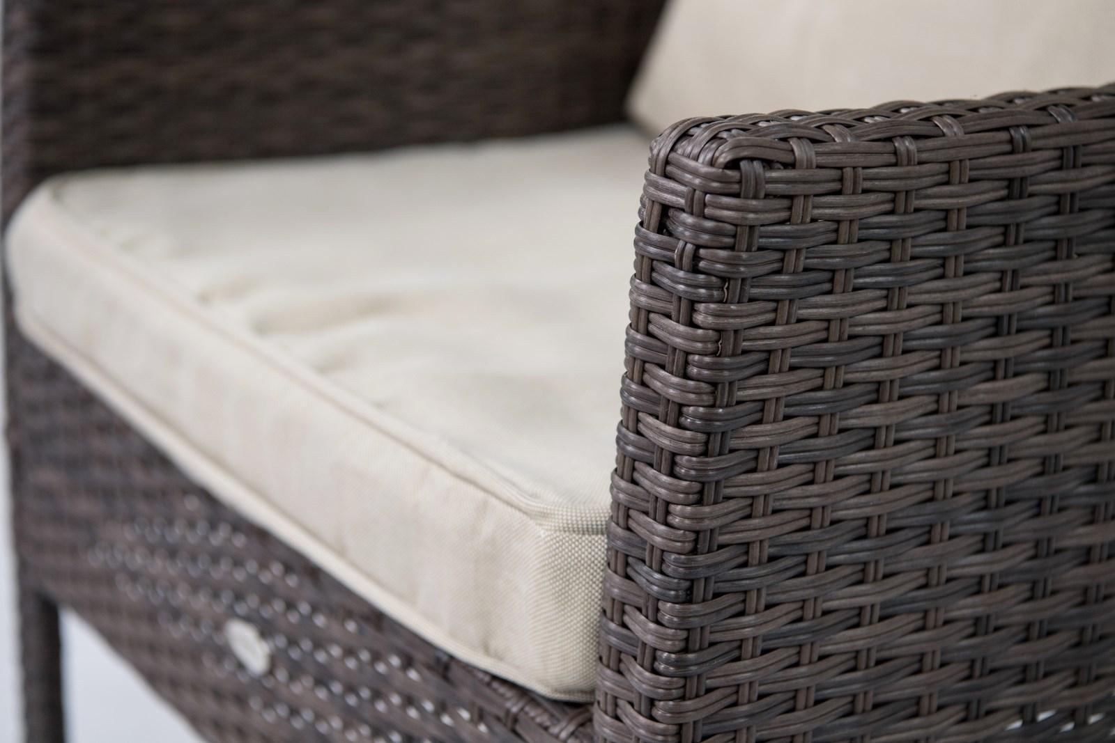 Na stelażu znajduje się płaska i efektowna plecionka technorattanowa, która jest podwójnie dzielona - oznacza to, że przez środek każdego paska przechodzi wgłębienie nadające plecionce charakterystycznej głębi. Zastosowana plecionka jest odporna na niekorzystne warunki atmosferyczne, więc opady deszczu czy promieniowanie UV nie jest problemem dla całej konstrukcji.