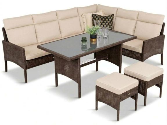 Prezentowany zestaw meble technorattanowe to propozycja, która spełni oczekiwania nawet najbardziej wymagających Klientów. W skład opisywanego kompletu wchodzi prostokątny, duży stół jadalniany o długości 120cm, dwie pufy oraz modułowy narożnik składający się z dwóch sof dwuosobowych, modułu środkowego i moduły narożnego. Dzięki takiej budowie, narożnik ustawić możemy jako lewostronny a także prawostronny, jego wymiary całkowite to 220x170cm. Meble cechują się wysokim oparciem, które jest szczególnie wygodne dla wysokich osób. Na każde siedzisko i oparcie przewidziano wygodną poduszkę. Komplet wykonano z bardzo dobrych jakościowo materiałów, zachowując jednocześnie najwyższą dbałość o każdy szczegół.