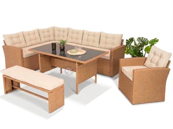 Prezentowany narożny zestaw mebli z technorattanu opiera się na stabilnym, metalowym stelażu, co gwarantuje trwałość i solidność. Meble pokrywa podwójna technorattanowa plecionka która jest bardziej odporna i wytrzymała niż naturalny rattan. Kolejną zaletą technorattanu jest fakt, że zestaw jest bardzo łatwy w utrzymaniu czystości - nie wymaga specjalnych środków czy specjalistycznej pielęgnacji. Do czyszczenia wystarczająca będzie tylko zwilżona ściereczka. Producent, aby nadać zestawowi unikalnego charakteru wykończył zestaw w plecionce szarpanej - dzięki temu zestaw wygląda bardziej naturalnie i jest obdarzony unikalnym charakterem.