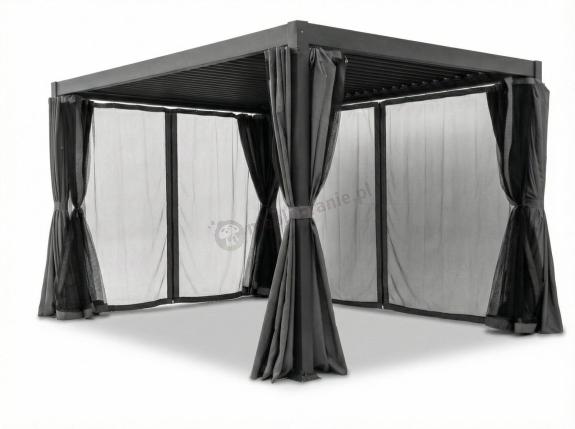 Zestaw zasłon i moskitier do pergoli Nefir 3x4 chroni przed słońcem, wiatrem i owadami. Wykonany z poliestru komplet na cztery ściany wyposażono w zamki błyskawiczne, troczki stabilizujące oraz system szybkiego montażu na haczykach w fabrycznych prowadnicach stelaża.