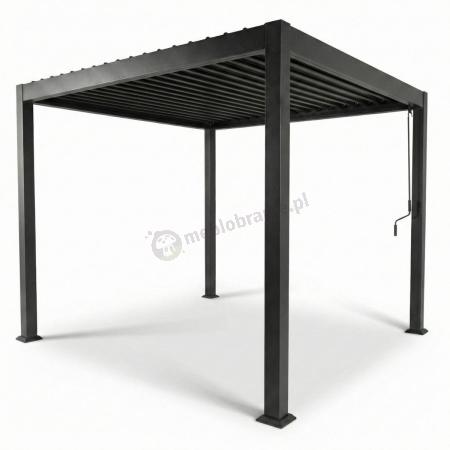 Nowoczesna konstrukcja o wymiarach 300x300x250 cm z systemem ruchomych lameli, chroniąca przed słońcem i deszczem.