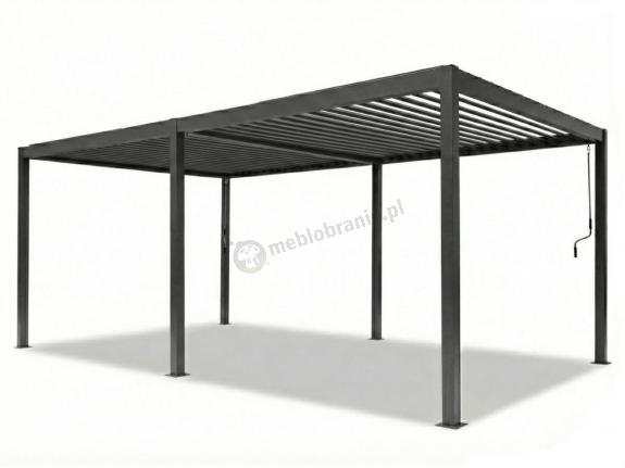 Nowoczesna konstrukcja o wymiarach 300x600x250 cm z systemem ruchomych lameli, chroniąca przed słońcem i deszczem.