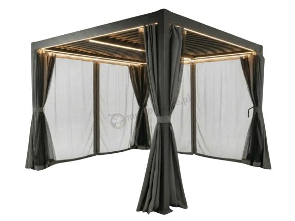 Pergolę Nefir można uzupełnić o elementy dodatkowe takie jak oświetlenie LED, moskitiery, rozsuwaną roletę lub zasłony, które chronią przed słońcem i zapewniają prywatność.