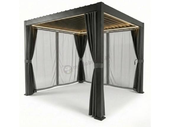 Pergolę Nefir można uzupełnić o elementy dodatkowe takie jak oświetlenie LED, moskitiery, rozsuwaną roletę lub zasłony, które chronią przed słońcem i zapewniają prywatność.