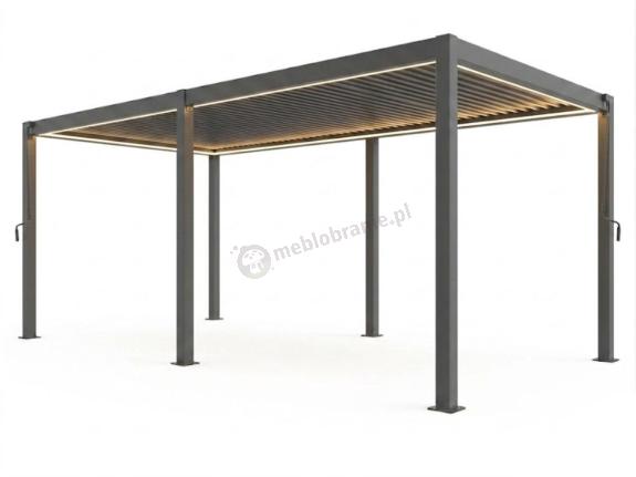 Nowoczesna konstrukcja o wymiarach 300x600x250 cm z systemem ruchomych lameli, chroniąca przed słońcem i deszczem.