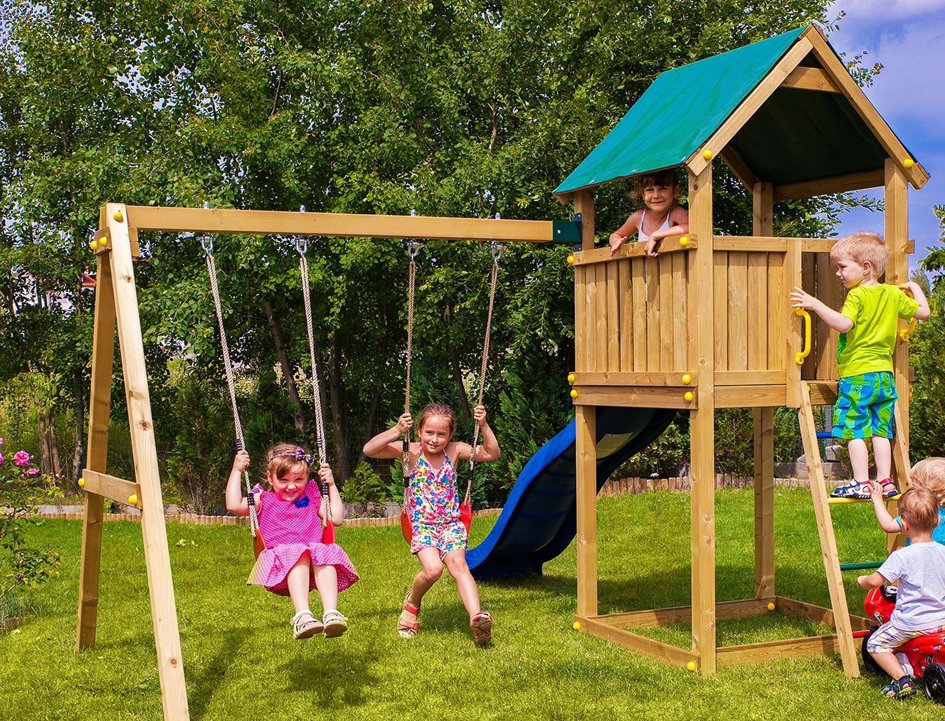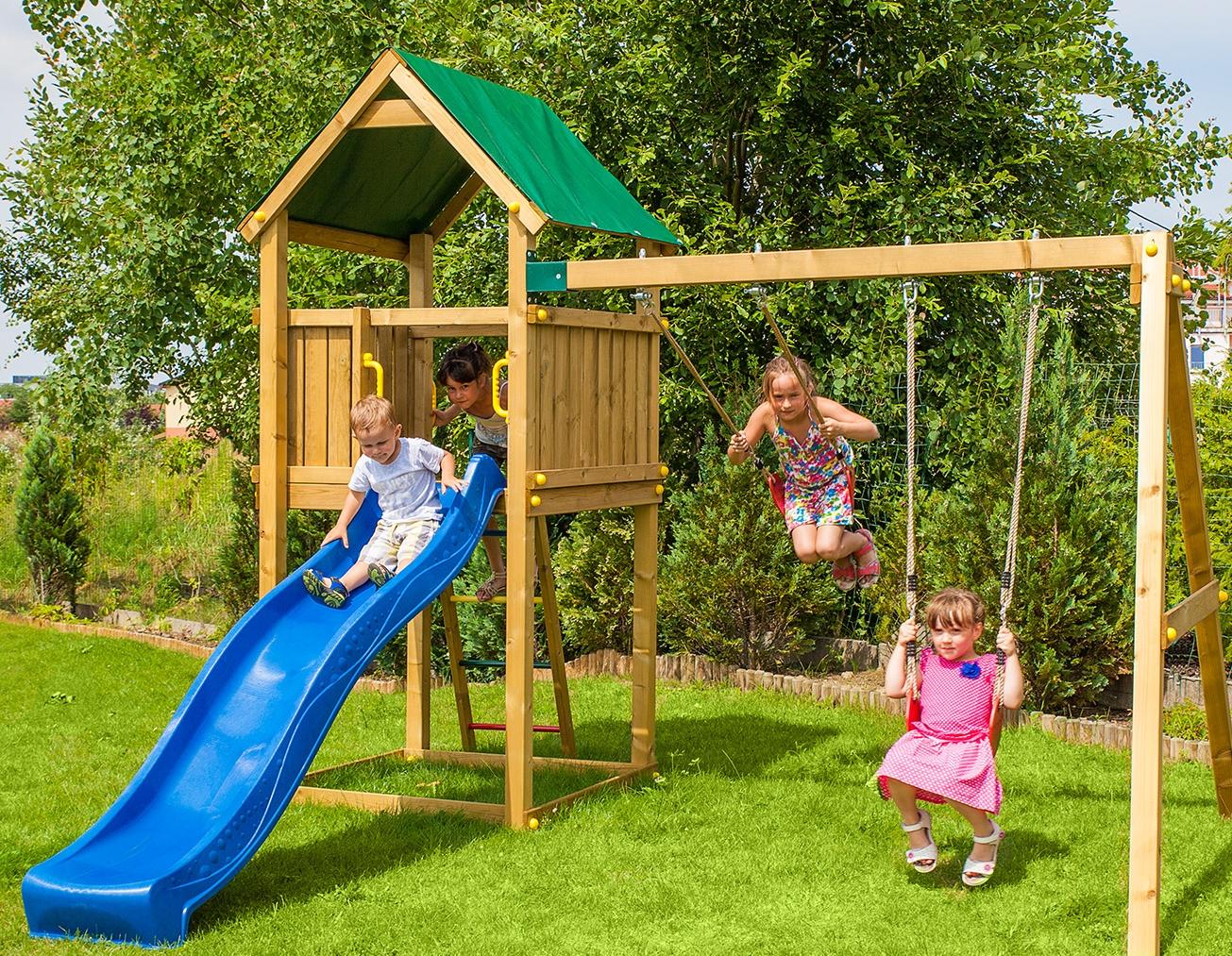 Do platformy zamontowano zjeżdżalnię o długości ślizgu wynoszącym 220 cm, która zapewni dużo aktywnej zabawy w zaciszu przydomowego ogródka. Zestaw zawiera huśtawkę z dwoma siedziskami w półokrągłym kształcie o szerokości 14 cm. Siedziska wykonano z elastycznego materiału odpornego na płowienie, przeznaczone są nawet dla starszych dzieci.