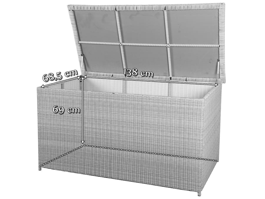 Skrzynia ogrodowa do mebli technorattanowych z serii Nilamito Brown pozwala na łatwe uporządkowanie różnego rodzaju przedmiotów pojawiających się w naszej przestrzeni wypoczynkowej. Najpopularniejsze jest jej wykorzystywanie jako skrzyni na poduszki z zestawów mebli ogrodowych, ale z powodzeniem można w niej zmieścić wiele innych akcesoriów tj. na zabawki lub narzędzie ogrodowe.