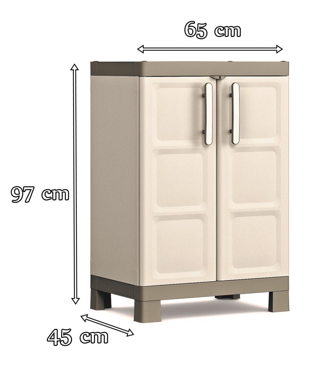 Szafa na balkon Excellence Low Cabinet beżowa ma wysokość 97 cm, długość 45 cm i głębokość 65 cm. Świetnie się sprawdzi w pomieszczeniach gospodarczych – piwnicach, garażach, pralniach, a także w domkach letniskowych czy w ogrodowych altanach. Może być również wykorzystywana w łazienkach, przedpokojach czy kuchniach. Szafa Excellence Low Cabinet beżowa nadaje się do łączenia z innymi szafami z serii Excellence ze względu na jednolitą stylistykę.