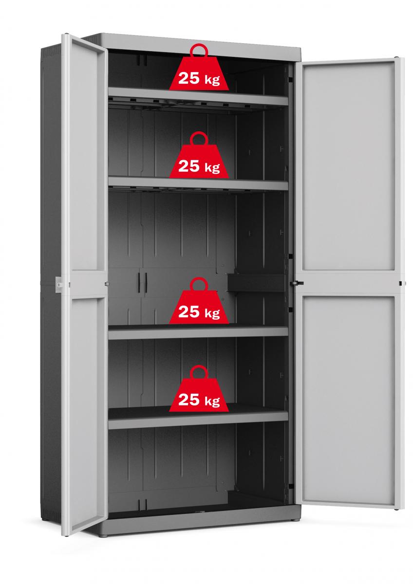 W środku szafy ogrodowej Logico High Cabinet XL znajdują się 4 funkcjonalne półki, które można dowolnie ustawiać, by stworzyć wnętrze idealnie odpowiadające naszym potrzebom. Półki mają udźwig do 25 kg każda. Istnieje możliwość zamknięcia drzwi na kłódkę (we własnym zakresie).
