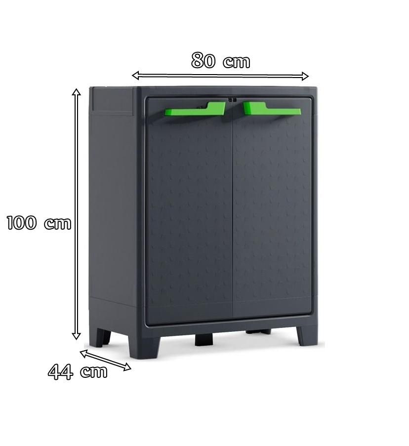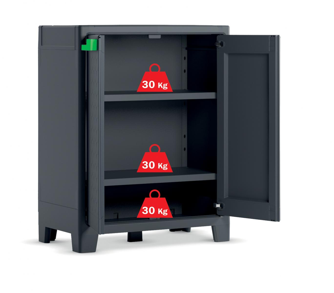 Szafa na balkon Moby Low Cabinet ciemnoszara posiada dodatkową nóżkę przy podstawie, a także możliwość regulacji wysokości nóżek. Dzięki temu meble są bardzo stabilne, również na nierównych powierzchniach. Duże uchwyty na drzwiach ułatwiają otwieranie szafki. Istnieje możliwość dodatkowego zabezpieczenia drzwi kłódką, we własnym zakresie. Pozwala to na lepsze zabezpieczenie znajdującego się wewnątrz sprzętu przed dostępem zwierząt czy dzieci. Szafa na balkon świetnie się sprawdzi nie tylko na dworze, ale też w garażu czy pomieszczeniu gospodarczym.