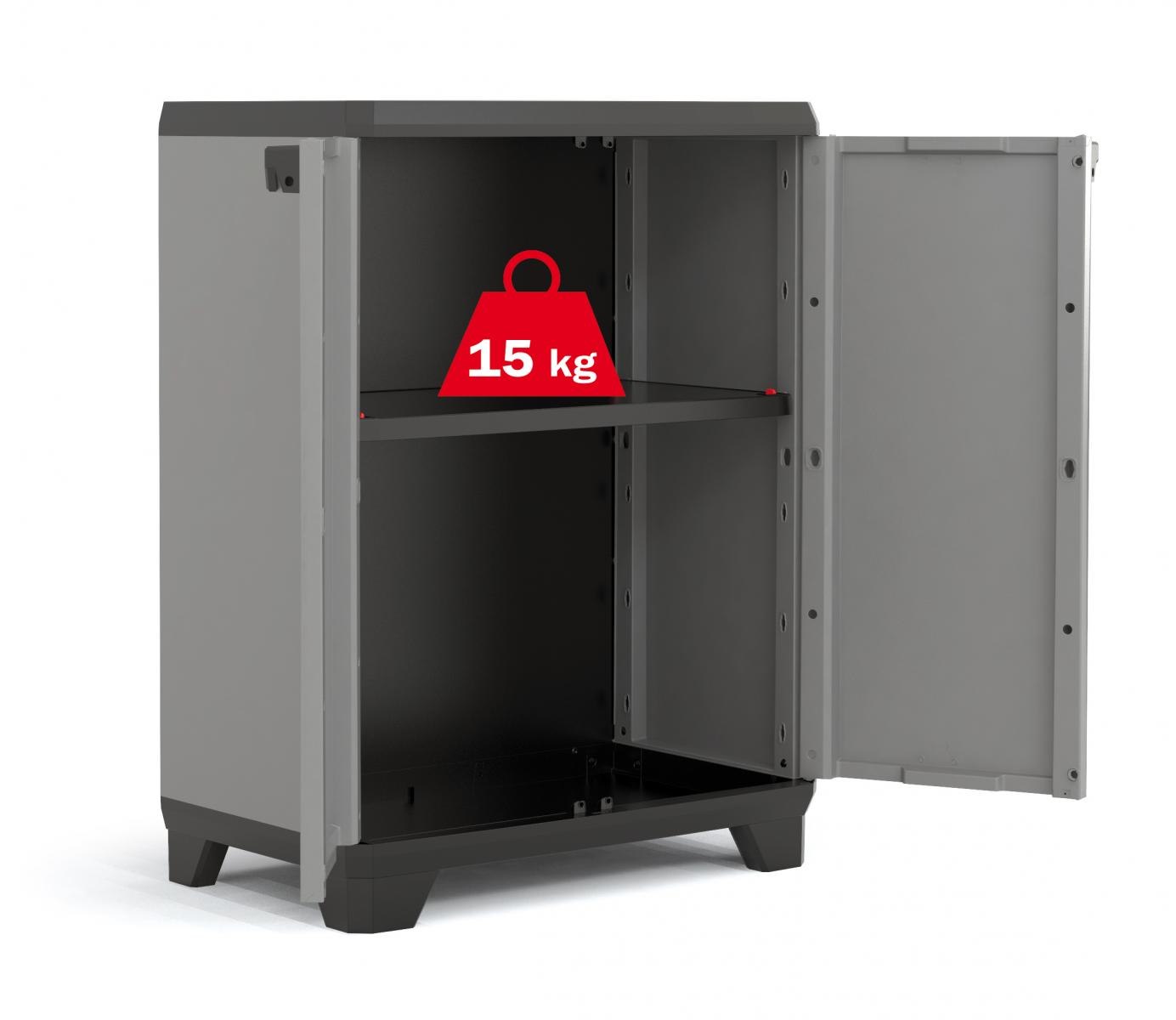 Szafka do przechowywania Stilo Low Cabinet ciemnoszara posiada wewnątrz jedną półkę o wytrzymałości 15 kg, którą można dowolnie ustawić. Mamy więc możliwość dopasowania układu szafy do naszych potrzeb. Nóżki szafy są regulowane, więc model będzie stabilny również na nierównym podłożu, np. wylewce betonowej pod domkiem ogrodowym. Dodatkowo można przymocować szafkę do ściany we własnym zakresie.