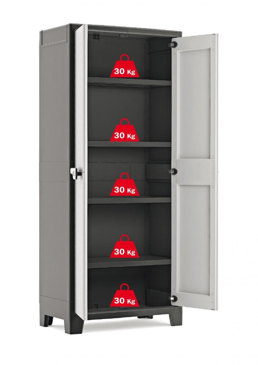Szafa ogrodowa Titan High Cabinet to mebel wykonany z wysokiej jakości tworzywa sztucznego uzupełnionego metalowymi detalami. Obudowa szafy jest w uniwersalnym czarno-szarym kolorze. Szafa wyposażona jest w metalowe zawiasy, a znajdujące się wewnątrz półki posiadają specjalne wzmocnienia zwiększające ich udźwig. Wewnątrz szafy mamy do dyspozycji 4 półki o nośności 30 kg każda, które można dowolnie regulować, zależnie od potrzeb. Szafa świetnie się sprawdzi jako mebel do przechowywania wykorzystywany w piwnicy, garażu czy warsztacie.