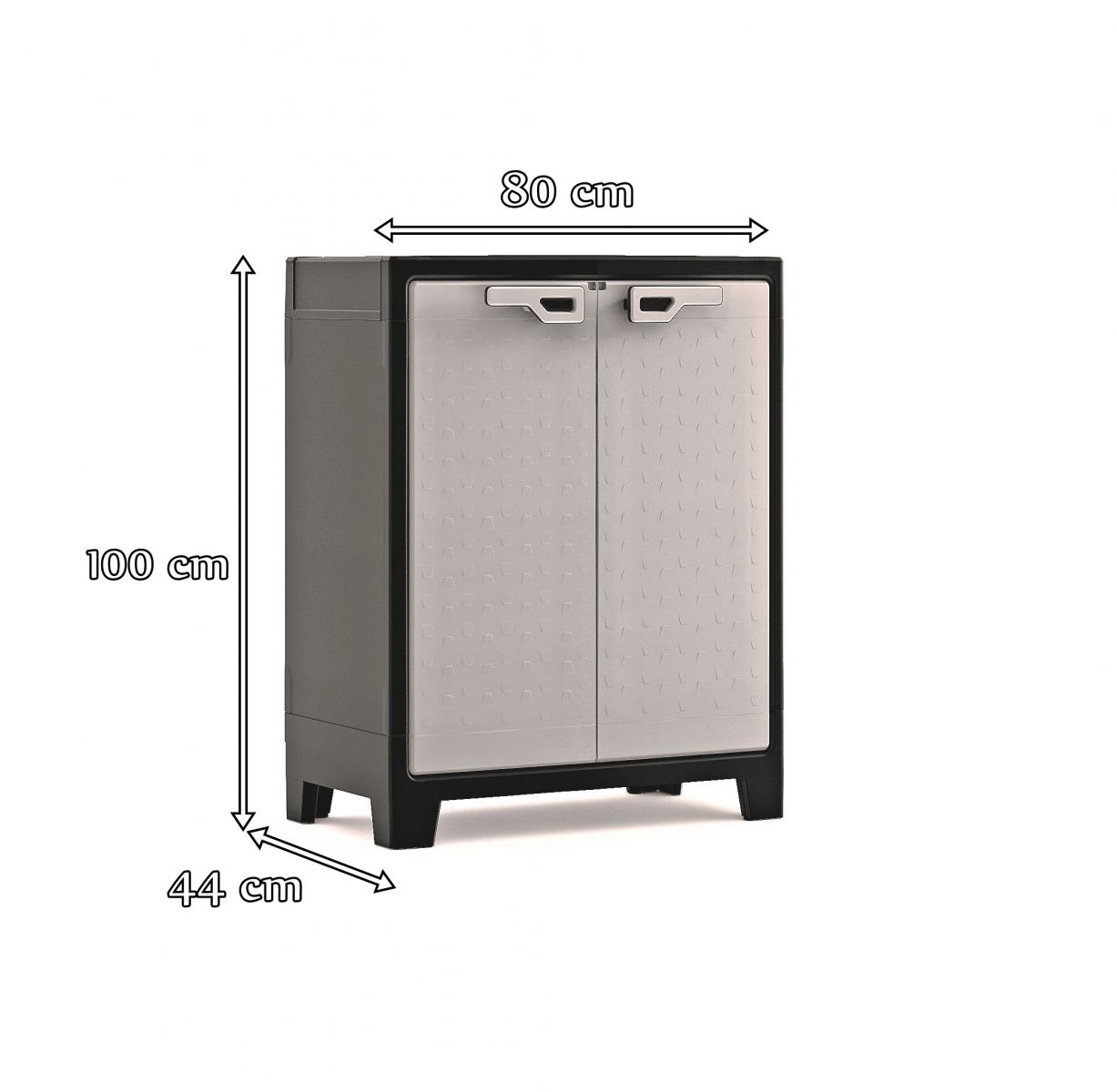 Dodatkową zaletą mebla jest możliwość regulacji wysokości nóżek i dodatkowa nóżka przy podstawie – dzięki temu szafa jest bardzo stabilna i sprawdzi się również na nierównej powierzchni. Szafa tarasowa Titan Low Cabinet czarno-szara posiada duże rączki, które ułatwiają otwieranie szafy. Drzwi można dodatkowo zabezpieczyć kłódką – mebel posiada specjalne otwory na jej wygodne zamontowanie. Szafa z tworzywa sztucznego świetnie się sprawdzi zarówno we wnętrzach, jak i w ogrodzie czy na balkonie.