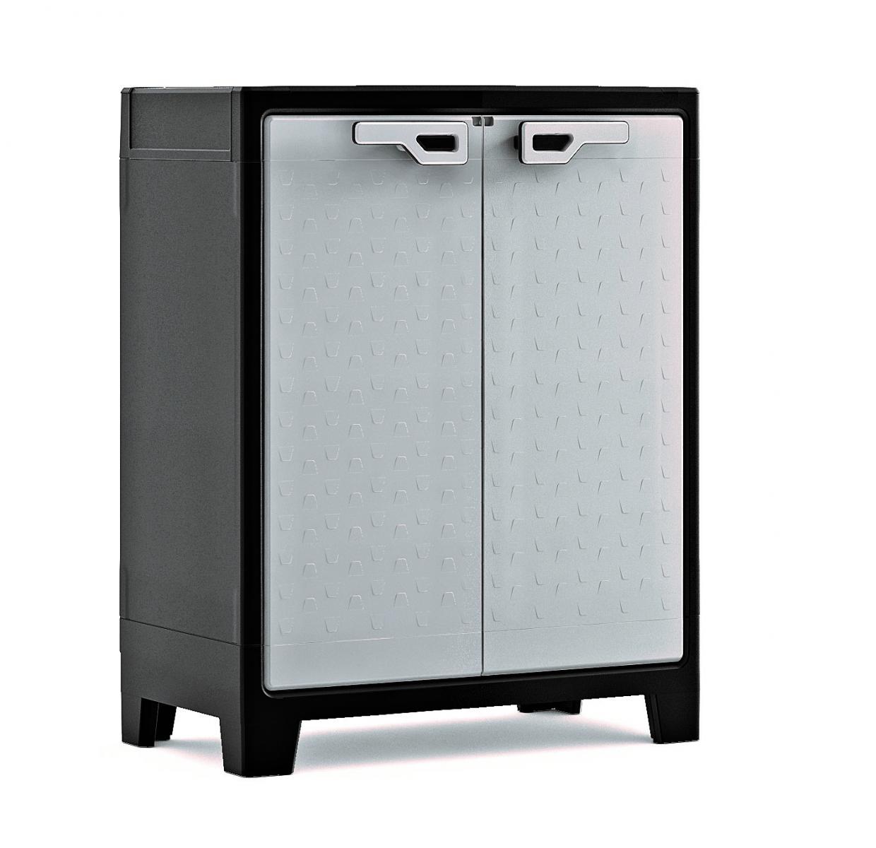 Mebel wykonano z wysokiej jakości plastiku, dodatkowo wzmocnionego w wykończeniu metalowymi elementami. Szafa tarasowa Titan Low Cabinet jest czarno-szara, więc dobrze wpasuje się w każde otoczenie. Dodatkowo wzmacniana konstrukcja półek i metalowe zawiasy gwarantują dużą solidność konstrukcji. Wewnątrz mamy do dyspozycji dwie półki o nośności 30 kg każda, które można dowolnie ustawiać, zależnie od potrzeb. Szafa tarasowa świetnie sprawdzi się w piwnicy, garażu czy domowym warsztacie do majsterkowania.