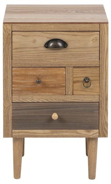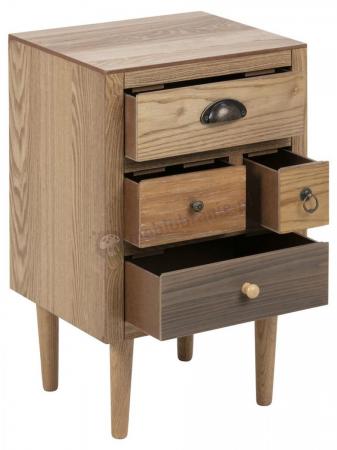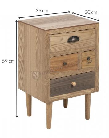 Szafka nocna wykonana jest z płyty MDF fornirowanej (jesion). Nóżki szafki wykonane są z drewna jesionowego. Szafka nocna z kolorowymi szufladami Thais ma 59 cm wysokości, 36 cm szerokości i 30 cm głębokości. Jej uniwersalne rozmiary sprawiają, że wpasuje się nawet w niewielkie przestrzenie. Komoda posiada cztery pojemne szuflady w różnych wymiarach na podręczne przedmioty. Wyjątkowości szafki nocnej nadają odcienie szuflad, każda w innym kolorze oraz z różnymi uchwytami.