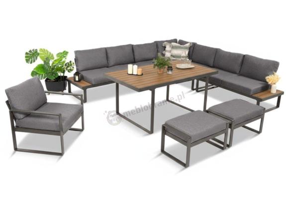 Narożnik Panaon Corner Grey Teak w komplecie z fotelem, dwiema pufami oraz stołem obiadowym 160x90x72 cm