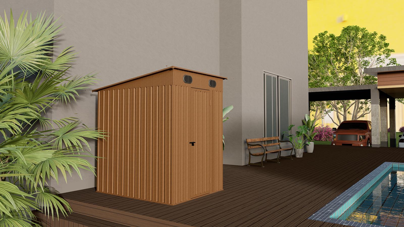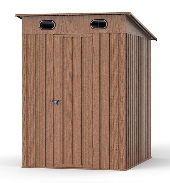 Prezentowy model wyróżnia jednospadowy dach, który nadaje całej konstrukcji ciekawszy wygląd. Jest to również wygodne rozwiązanie umożliwiające łatwe usuwanie zaległego śniegu lub nieczystości z dachu. Dach montować można spadkiem do tyłu bądź do przodu. Nad drzwiami zamieszczono otwory wentylacyjne zapewniające dopływ powietrza, dzięki któremu we wnętrzu nie gromadzi się wilgoć i jest dużo mniejsze ryzyko pojawienia się pleśni. Nie pojawi się więc nieprzyjemny zapach, a nasze przedmioty nie ucierpią. Dwuspadowy dach spoczywa na trzech belkach, więc nawet przy obfitych opadach śniegu konstrukcja domku nie jest zagrożona.