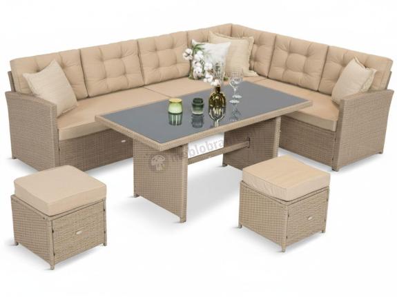 Zestaw mebli z technorattanu to propozycja, która spełni oczekiwania nawet najbardziej wymagających Klientów. W skład opisywanego kompletu wchodzi prostokątny, duży stół jadalniany o długości 145cm, dwie pufy oraz narożnik składający się z dwóch sof dwuosobowych, modułu środkowego i modułu narożnego. Dzięki modułowej budowie narożnik może być lewo bądź prawostronny. Całkowite wymiary narożnika po zestawieniu modułów to 250x190cm. Na każde siedzisko i oparcie przewidziano wygodną poduszkę. Komplet wykonano z bardzo dobrych jakościowo materiałów, zachowując jednocześnie najwyższą dbałość o każdy szczegół. Meble te nadają się nie tylko do użytku wewnętrznego ale i zewnętrznego.